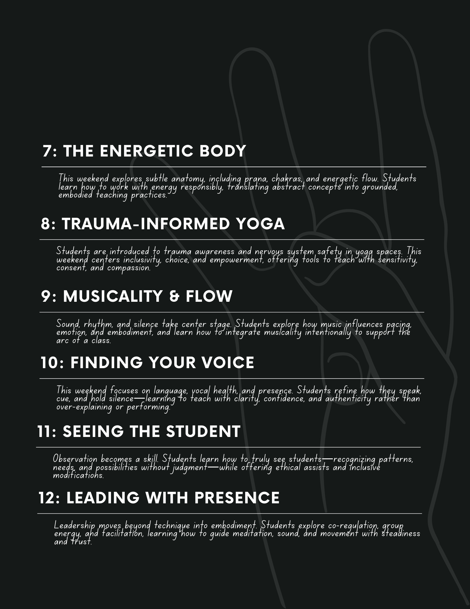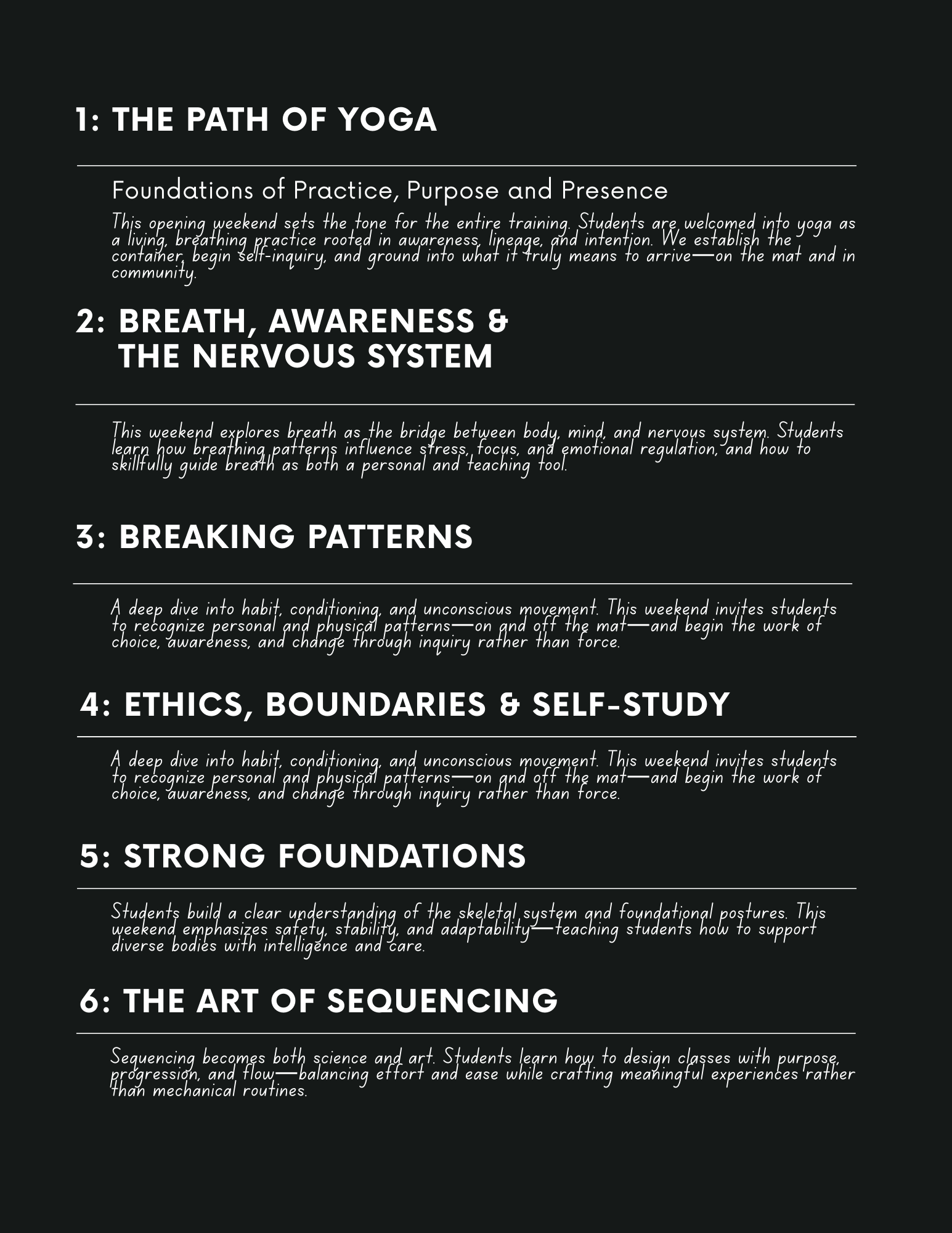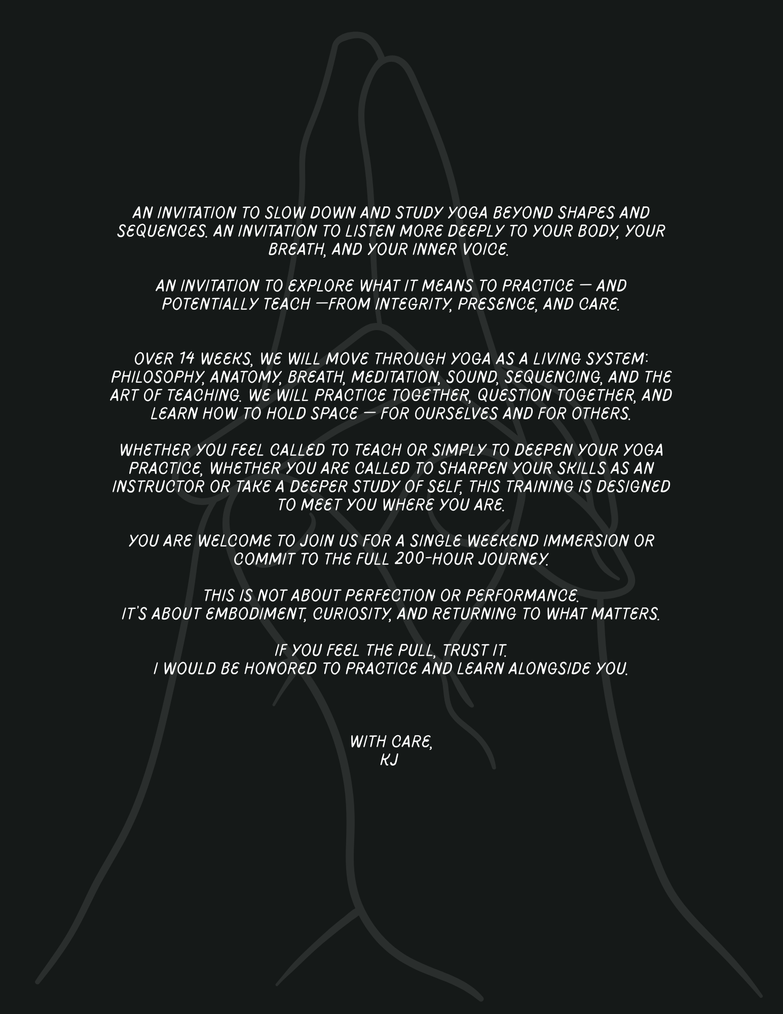 This 200-hour accredited RYT training is an immersive, transformative journey—one that meets you on the mat and ripples far beyond it. The curriculum is designed to deepen your physical practice while cultivating emotional intelligence, embodied self-awareness, and grounded leadership. You’ll gain the skills and confidence to teach yoga with clarity and integrity, while learning how to live the practice—bringing its wisdom into your daily life, relationships, and the communities you serve.